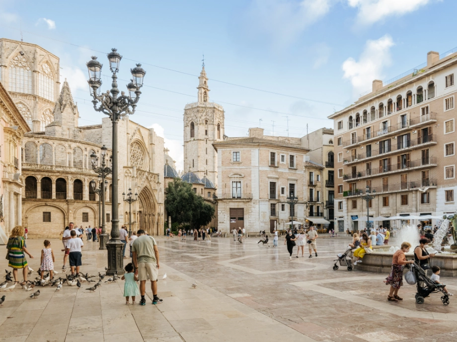 - Dirígete a la hermosa Plaza de la Virgen y sumérgete en su singularidad medieval. Descubre los contrastes del casco antiguo, desde la conquista por Jaime I en el siglo XIII hasta la icónica catedral de Valencia y el Miguelete.